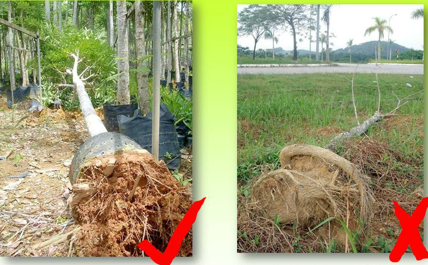 Root coiled happen when seedlings are kept too long in the nursery, the roots find no way to expand their way downwards in the limited area, eventually the roots coiled. In order to reduce the mortality rate, seedlings are ready to transplanting into ground when achieving 60~90cm height. Older seedlings might not be good due to root coiling in the confined polybag if polybag is not big enough.