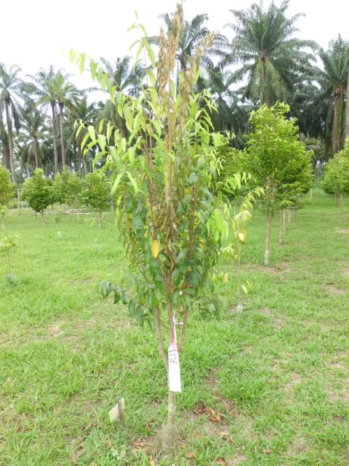 Upper branch had been bored by the worm, leafs were drying. The upper stem will be cut if no hope to recover. Worker noticed the attack was too late.