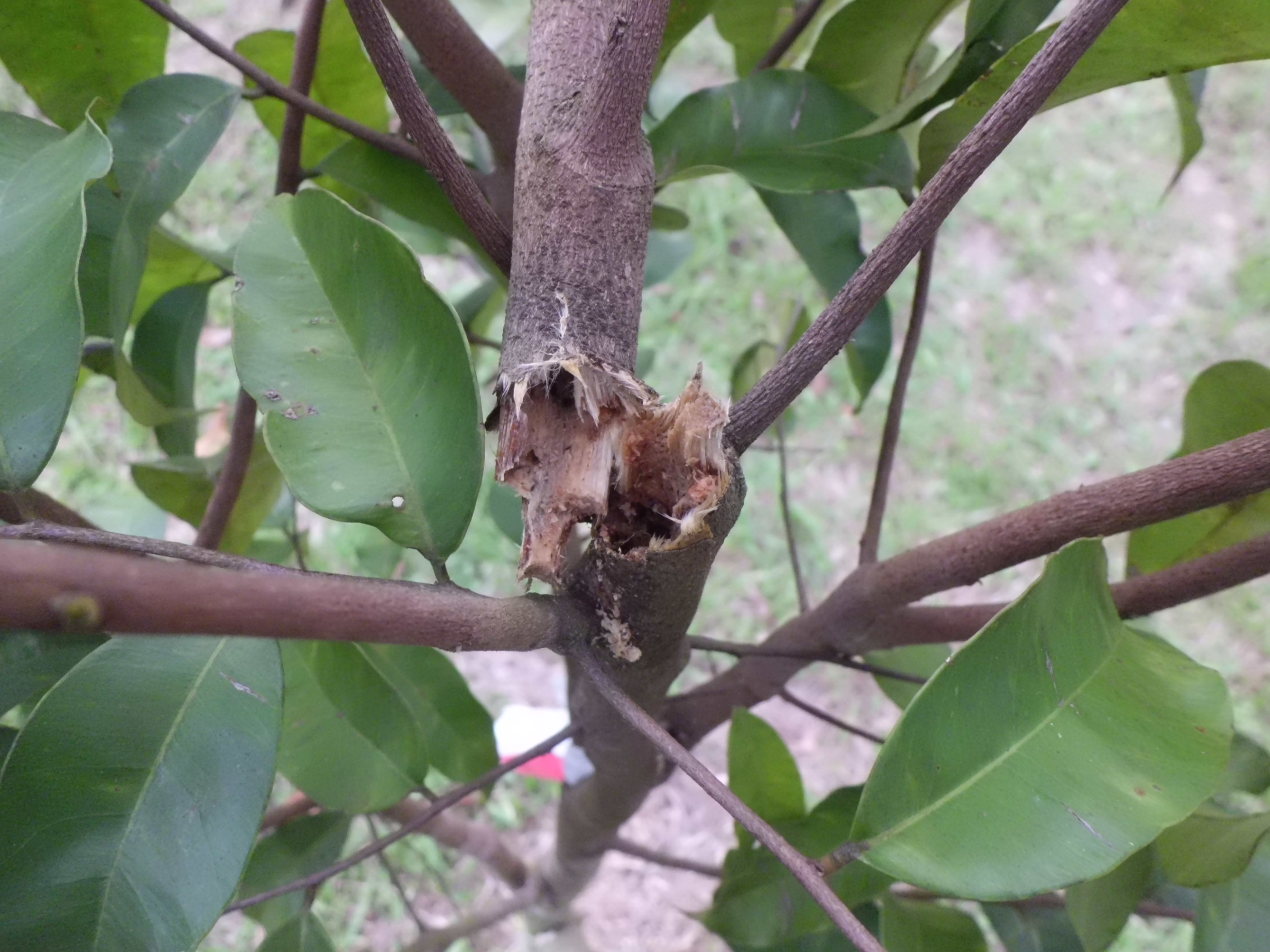 Stem borers are caterpillars insects from the MOTH / BEETLE. Mature adult beetles will lay the eggs and hatch into larvae. Larvae dig into the trunk and takes few months to mature. The larvae will tunnel along the branch to the branches and the main stem. It emits frass through holes drilled. Effect of attack can be seen when we see the leaves and shoots become yellow and dry.