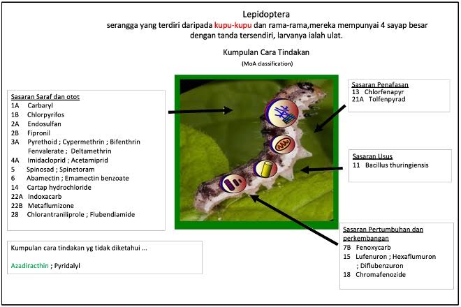 • Hindari penggunaan insektisida berulang secara eksklusif dari sub-kelompok bahan kimia yang sama, (ditunjukkan dengan nomor IRAC MoA Group).
