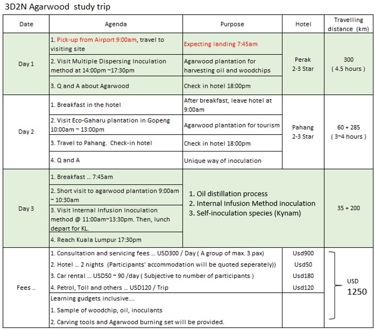 I am interested to learn more about agarwood directly from your and your plantation. The processes including from panting, inoculation and harvesting, and latest technology on inoculation Do you have a scheduled study trip next year maybe March or April? If there is, I would like to know the itineraries of the activities and the cost so I could make a plan for it. Thanks.