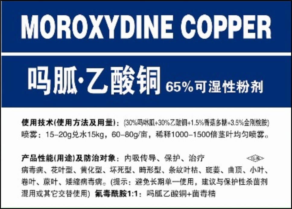 The product is prepared by copper acetate and hydrochloric acid moroxydine; it has the effects of protection and controlling, when it is sprayed on leaves of plants, it can enter the bodies of plants via air holes to inhibit and damage synthesis of nucleic acid and lipoprotein and block reproduction of bacteria, so that the effect of preventing and controlling bacteria is achieved; it has special effects of preventing and controlling symptoms caused by striped virus, dwarf virus, yellow leaf virus, etc. spread by sap-sucking pests.