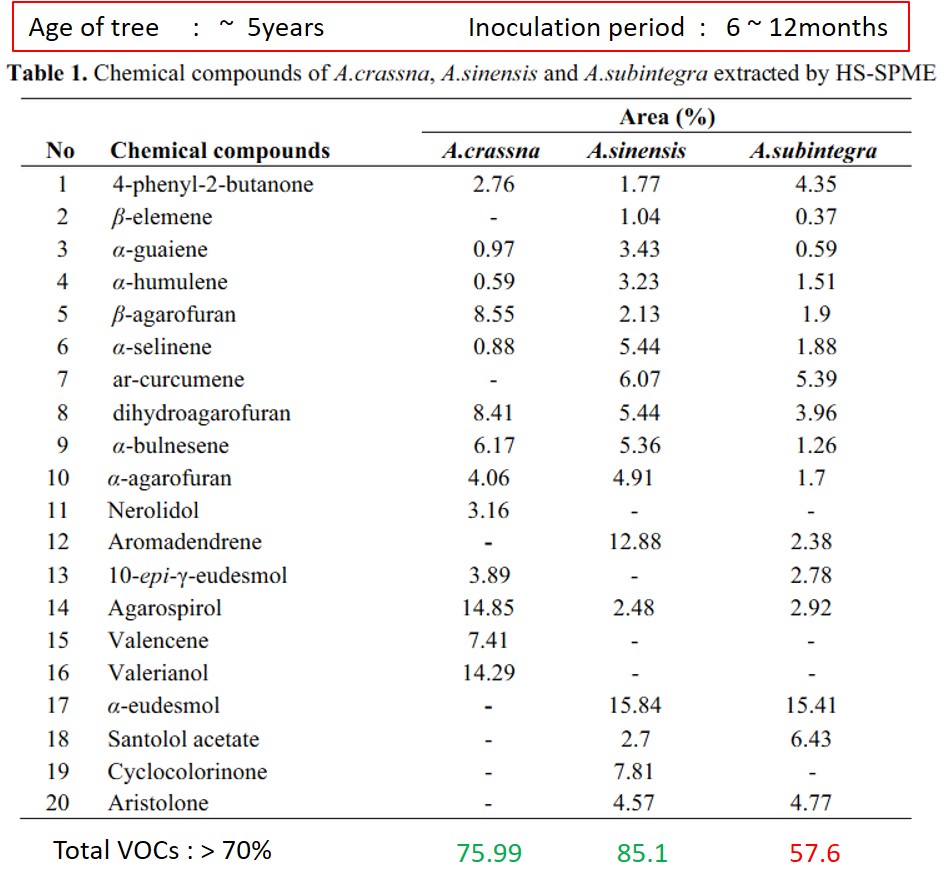 These volatiles compounds extraction was done by Headspace-Solid Phase Microextraction (HS-SPME). All those volatile compounds obtained from these Aquilaria spp. mostly found by others research studies on the chemistry of agarwood oils. This study does NOT conclude that A. subintegra is of lower quality than A.Sinensis, there are few dependent factors need to be considered. As far as cultivated agarwood is concerned, one of the key factor is “man-made inoculant” applied.