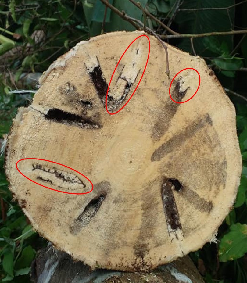 If the tree is very healthy, where the TUG-of-WAR is won by the tree’s defense mechanism, than most probably the treated bark will end up in white tissue, where the wounded bark has recovered.
