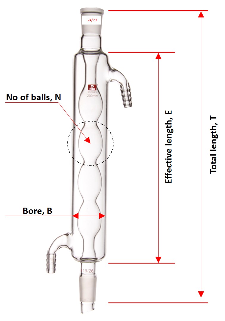 An Allihn condenser is one of the component for setting up a distillation apparatus. This borosilicate glass condenser has a ball inner tube to provide additional surface area for highly efficient cooling.